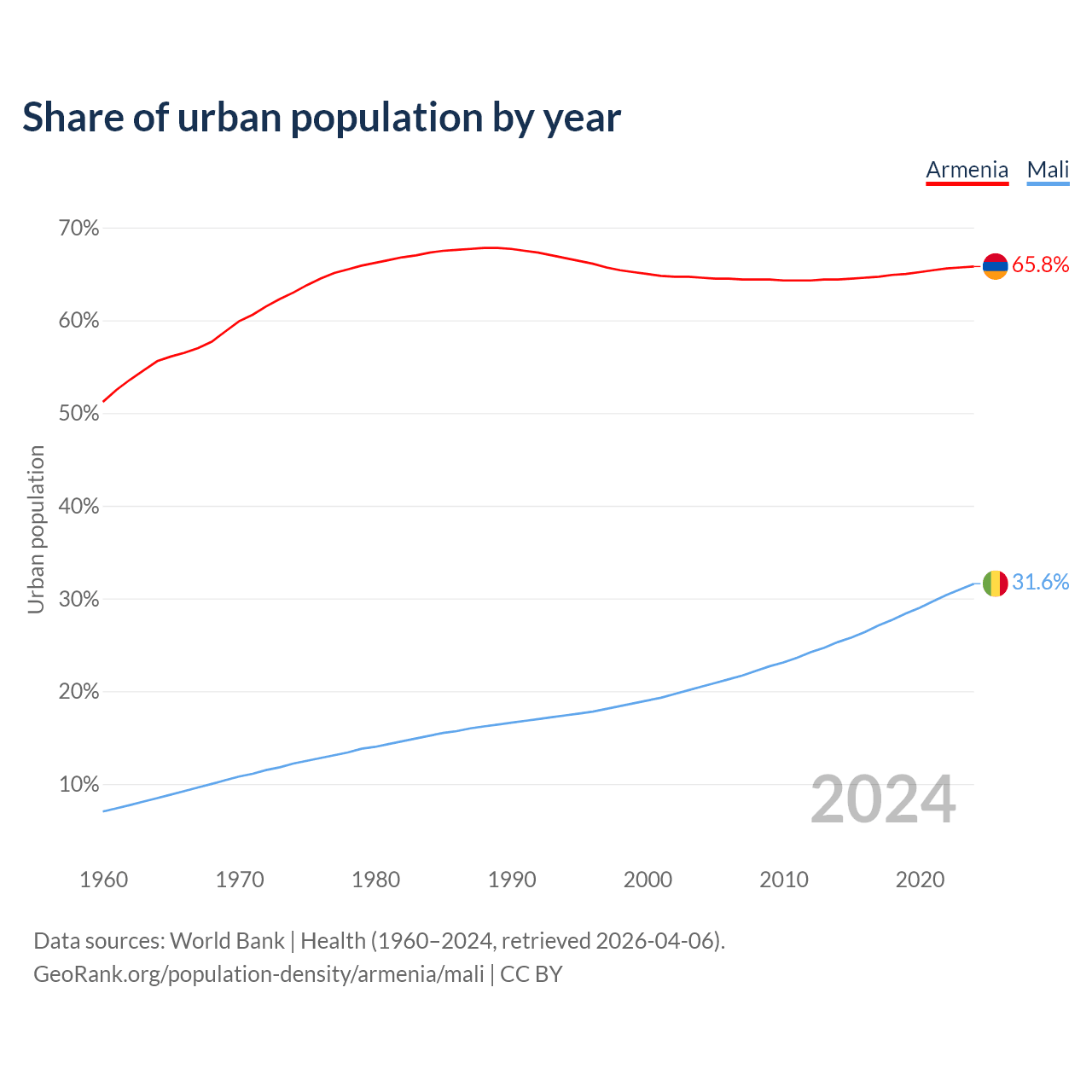 From 2004 to 2024, the share of urban population changed from 64.6% to 65.8% in Armenia and from 20.5% to 31.6% in Mali.