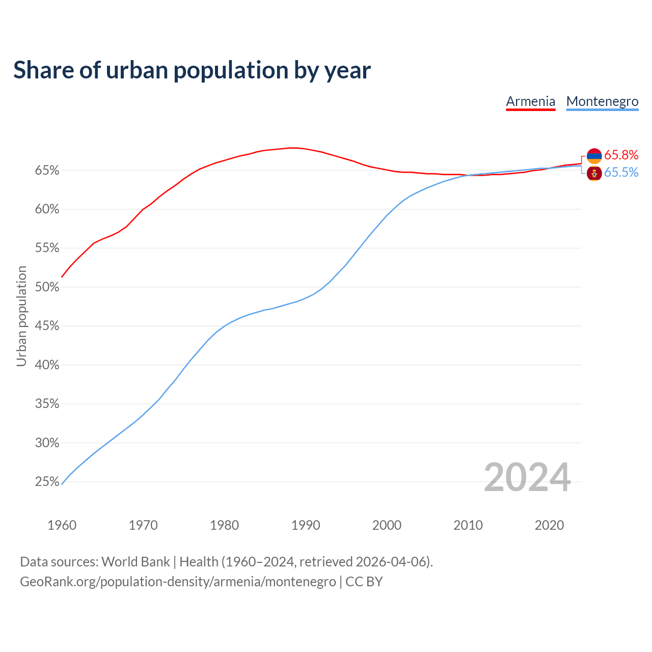 From 2004 to 2024, the share of urban population changed from 64.6% to 65.8% in Armenia and from 62.2% to 65.5% in Montenegro.