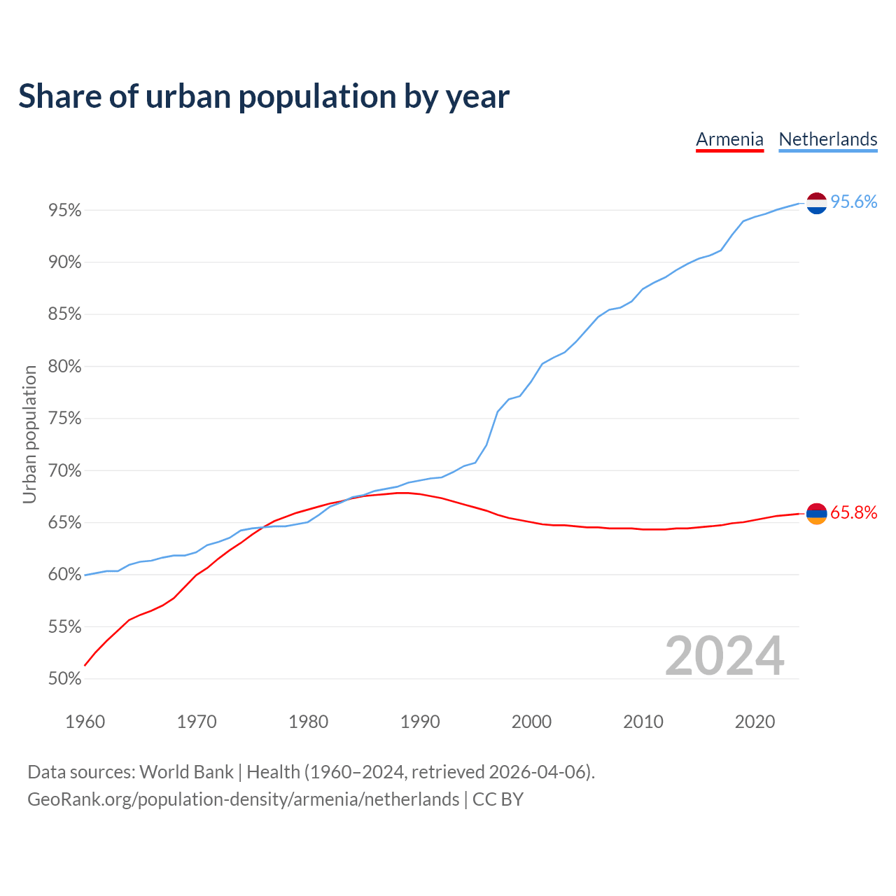 From 2004 to 2024, the share of urban population changed from 64.6% to 65.8% in Armenia and from 82.3% to 95.6% in the Netherlands.