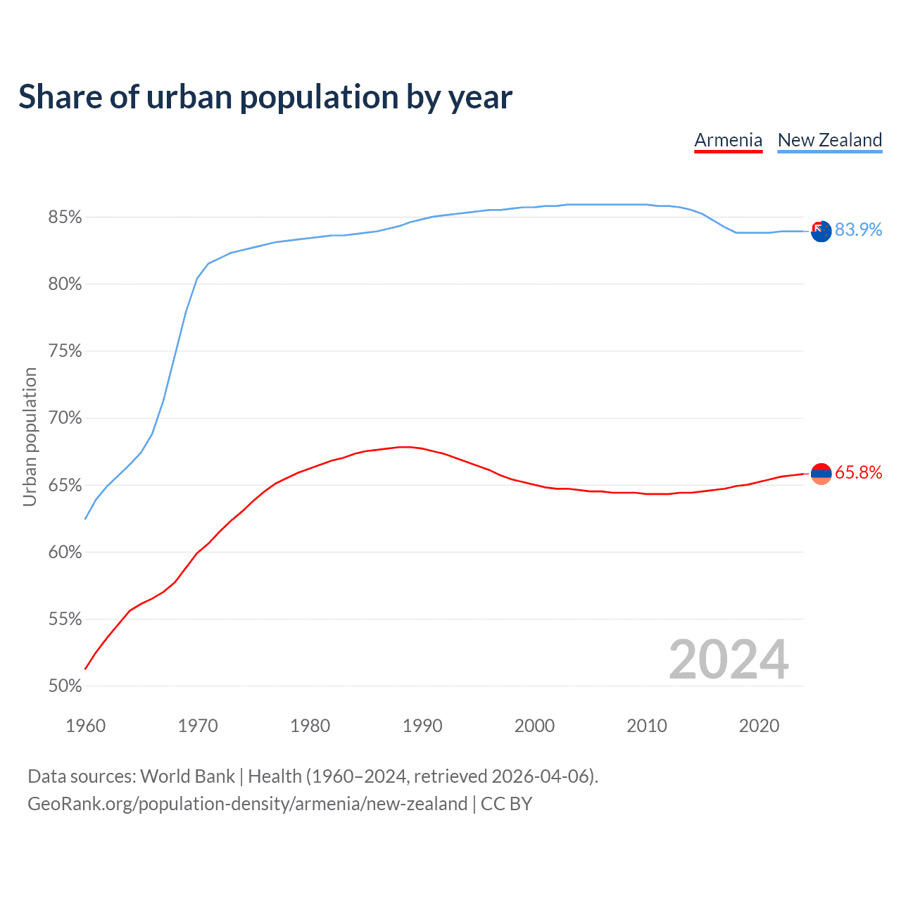 From 2004 to 2024, the share of urban population changed from 64.6% to 65.8% in Armenia and from 85.9% to 83.9% in New Zealand.