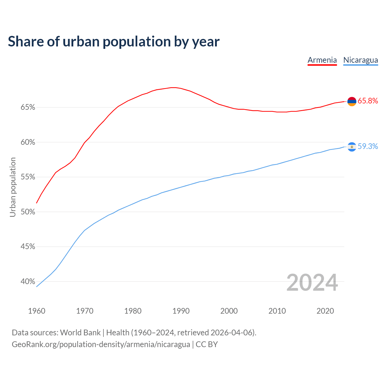 From 2004 to 2024, the share of urban population changed from 64.6% to 65.8% in Armenia and from 55.8% to 59.3% in Nicaragua.