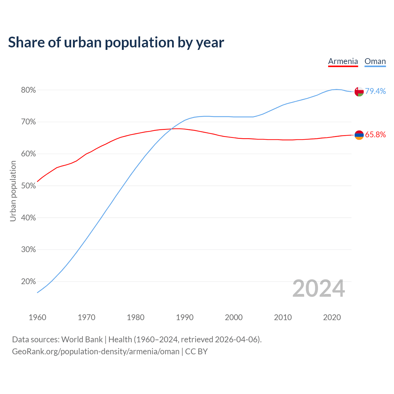 From 2004 to 2024, the share of urban population changed from 64.6% to 65.8% in Armenia and from 71.5% to 79.4% in Oman.