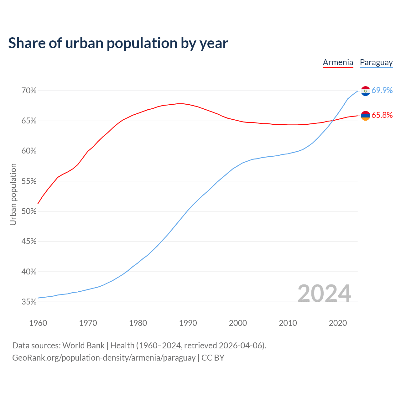 From 2004 to 2024, the share of urban population changed from 64.6% to 65.8% in Armenia and from 58.7% to 69.9% in Paraguay.