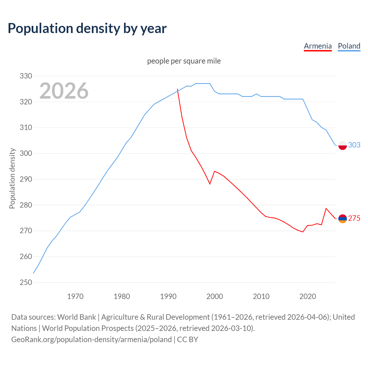 From 2006 to 2026, population density in Armenia decreased by 3.47%, compared to a 6.1% decline in Poland.