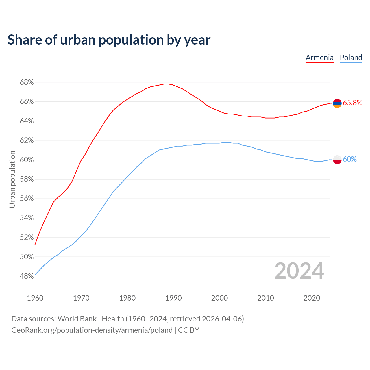 From 2004 to 2024, the share of urban population changed from 64.6% to 65.8% in Armenia and from 61.7% to 60% in Poland.