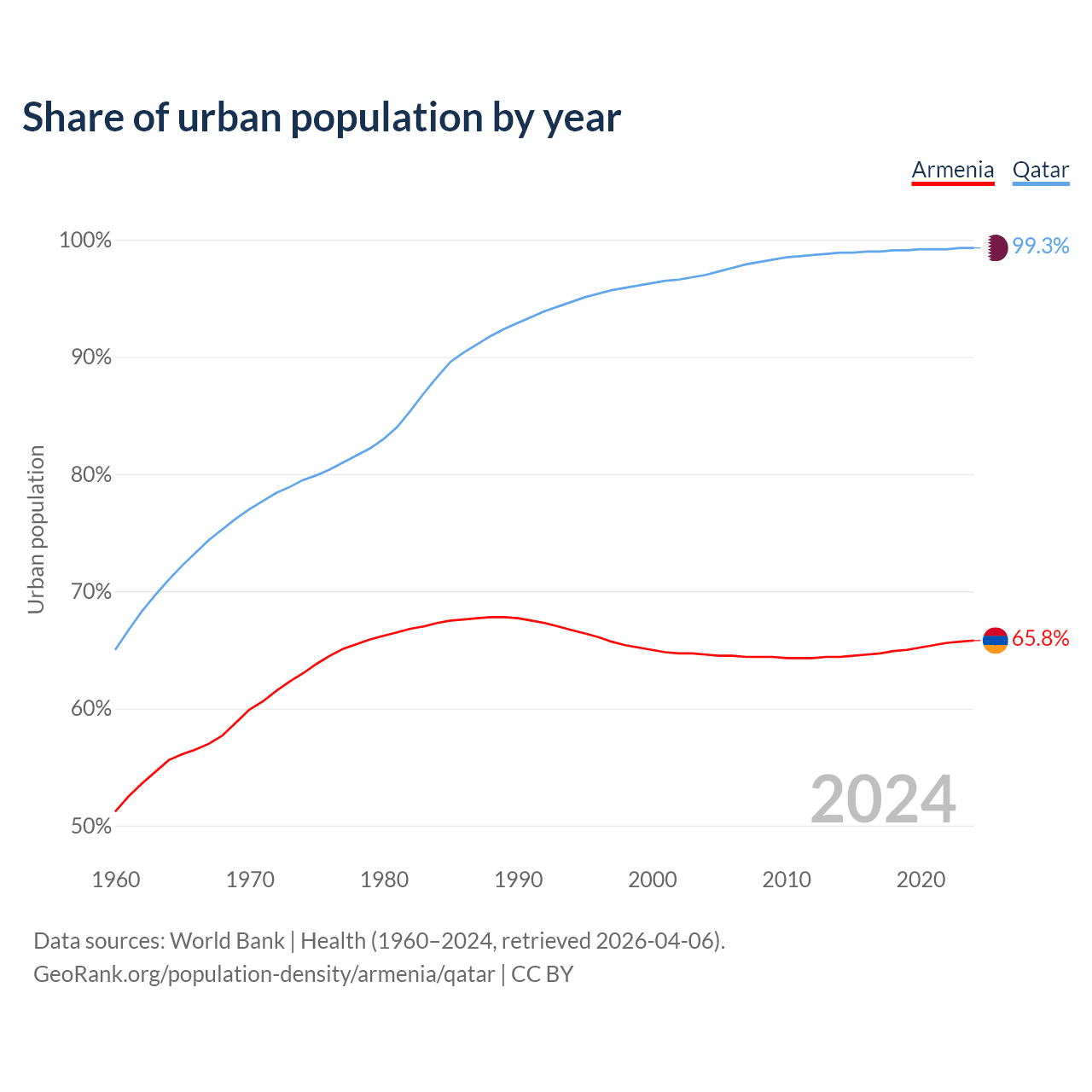 From 2004 to 2024, the share of urban population changed from 64.6% to 65.8% in Armenia and from 97% to 99.3% in Qatar.