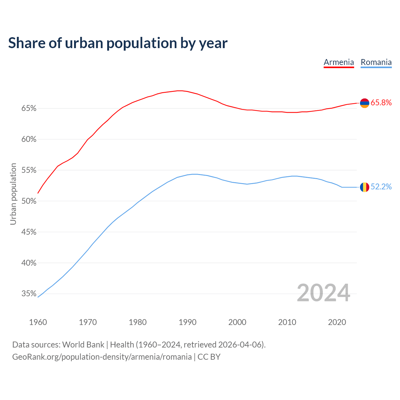 From 2004 to 2024, the share of urban population changed from 64.6% to 65.8% in Armenia and from 52.9% to 52.2% in Romania.