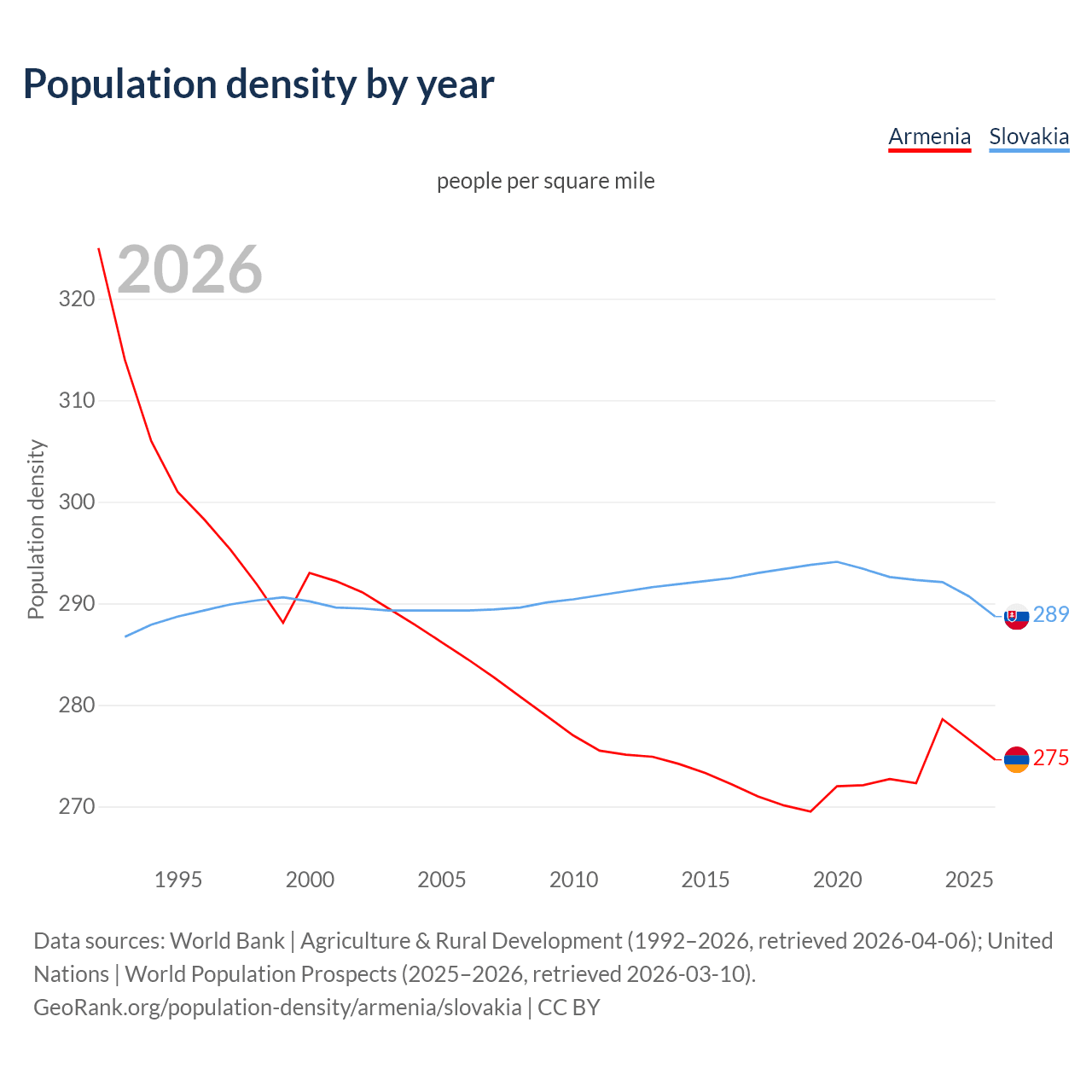 From 2006 to 2026, population density in Armenia decreased by 3.47%, compared to a 0.21% decline in Slovakia.