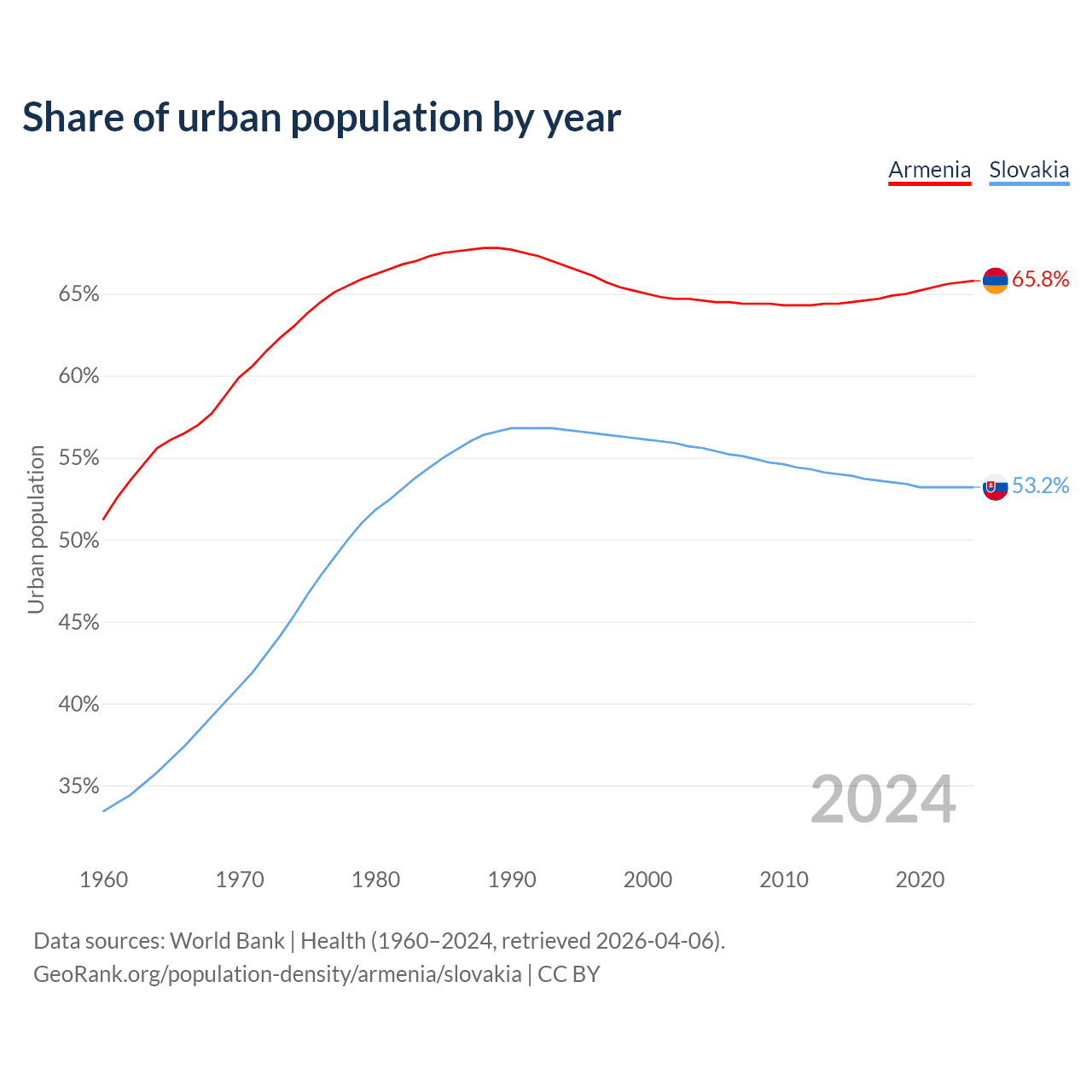 From 2004 to 2024, the share of urban population changed from 64.6% to 65.8% in Armenia and from 55.6% to 53.2% in Slovakia.