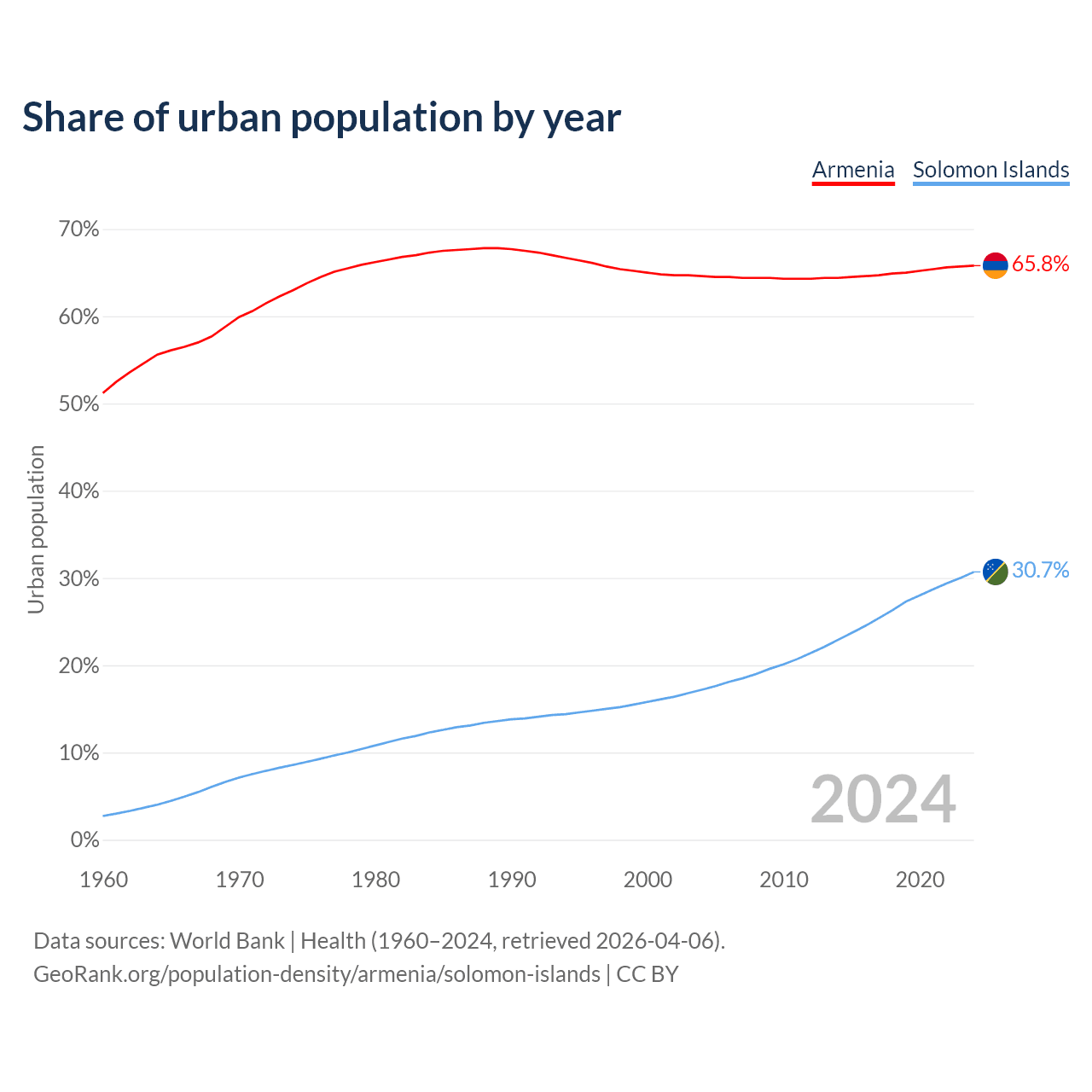 From 2004 to 2024, the share of urban population changed from 64.6% to 65.8% in Armenia and from 17.2% to 30.7% in the Solomon Islands.