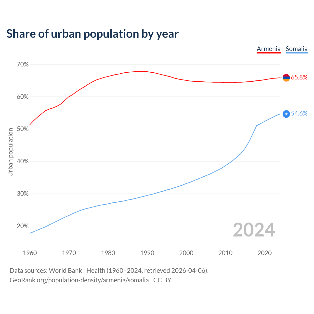 From 2004 to 2024, the share of urban population changed from 64.6% to 65.8% in Armenia and from 35% to 54.6% in Somalia.