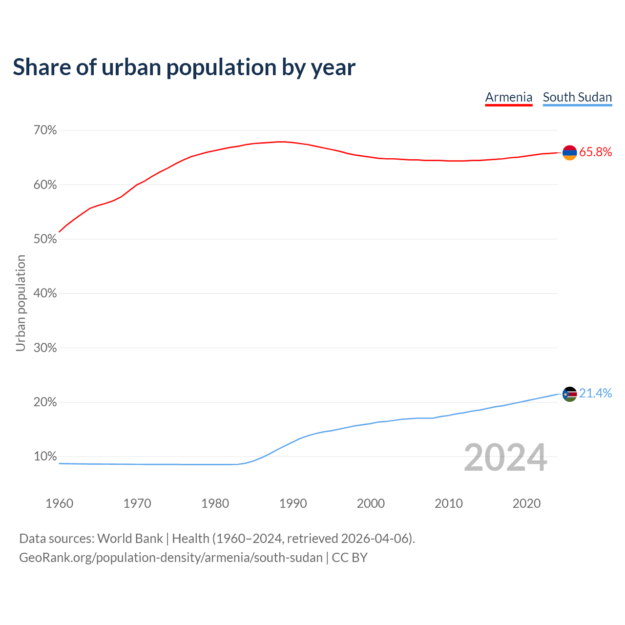 From 2004 to 2024, the share of urban population changed from 64.6% to 65.8% in Armenia and from 16.8% to 21.4% in South Sudan.