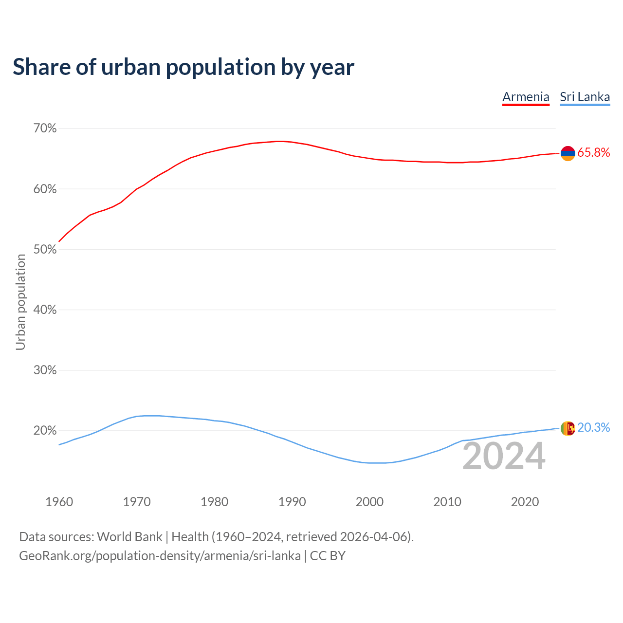 From 2006 to 2026, population density in Armenia decreased by 3.47%, compared to a 10.4% growth in Sri Lanka.