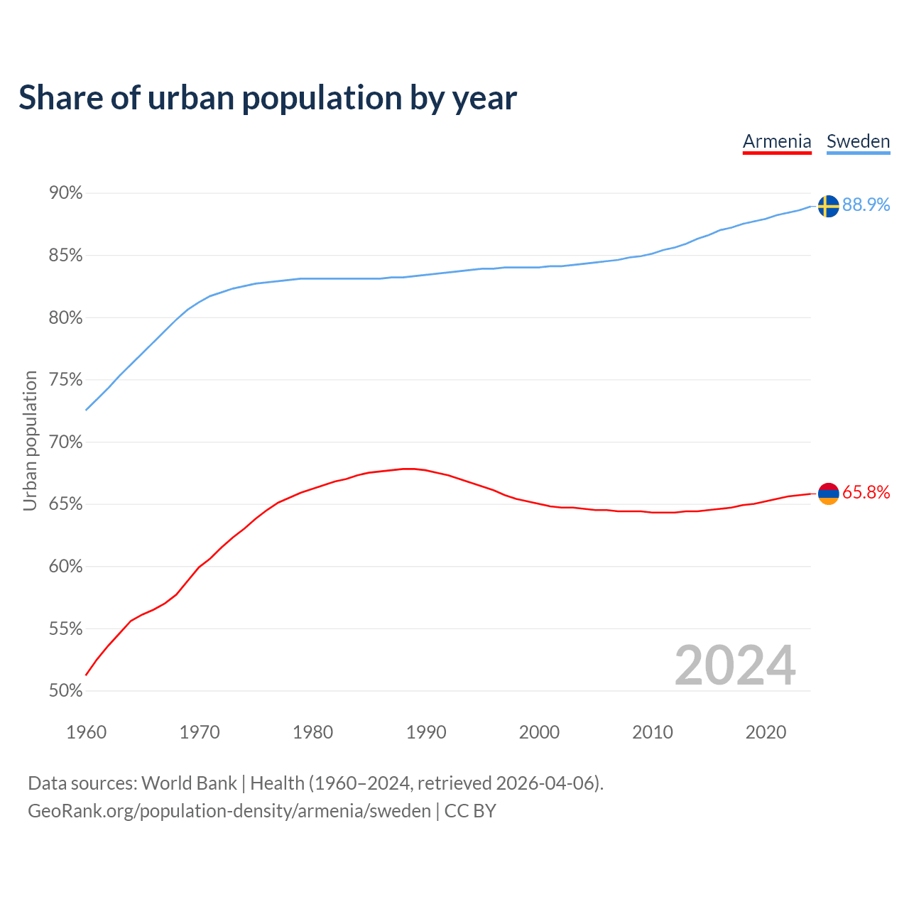 From 2004 to 2024, the share of urban population changed from 64.6% to 65.8% in Armenia and from 84.3% to 88.9% in Sweden.