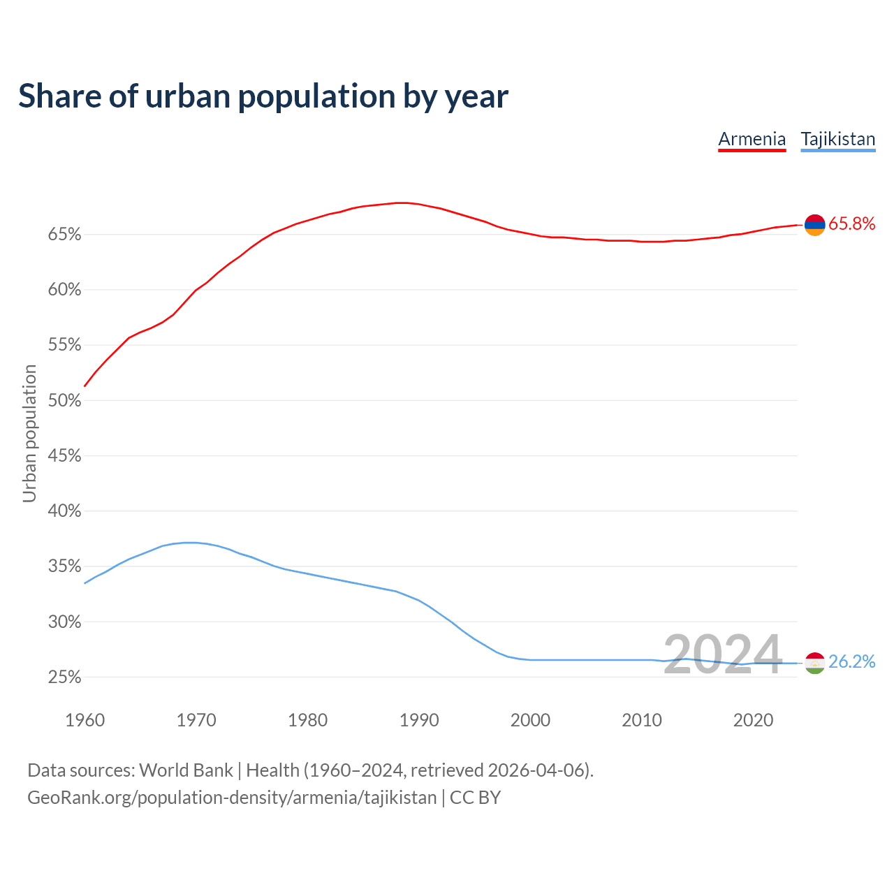 From 2004 to 2024, the share of urban population changed from 64.6% to 65.8% in Armenia and from 26.5% to 26.2% in Tajikistan.