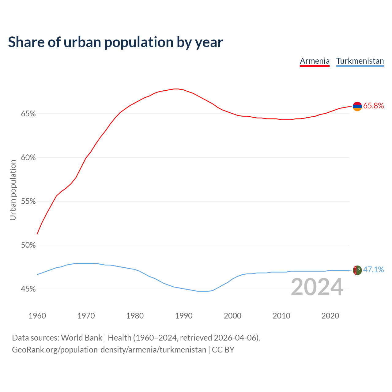 From 2004 to 2024, the share of urban population changed from 64.6% to 65.8% in Armenia and from 46.7% to 47.1% in Turkmenistan.