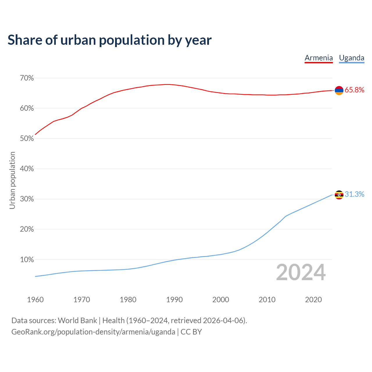 From 2004 to 2024, the share of urban population changed from 64.6% to 65.8% in Armenia and from 13.1% to 31.3% in Uganda.