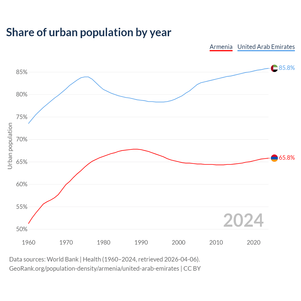 From 2004 to 2024, the share of urban population changed from 64.6% to 65.8% in Armenia and from 81.5% to 85.8% in the United Arab Emirates.