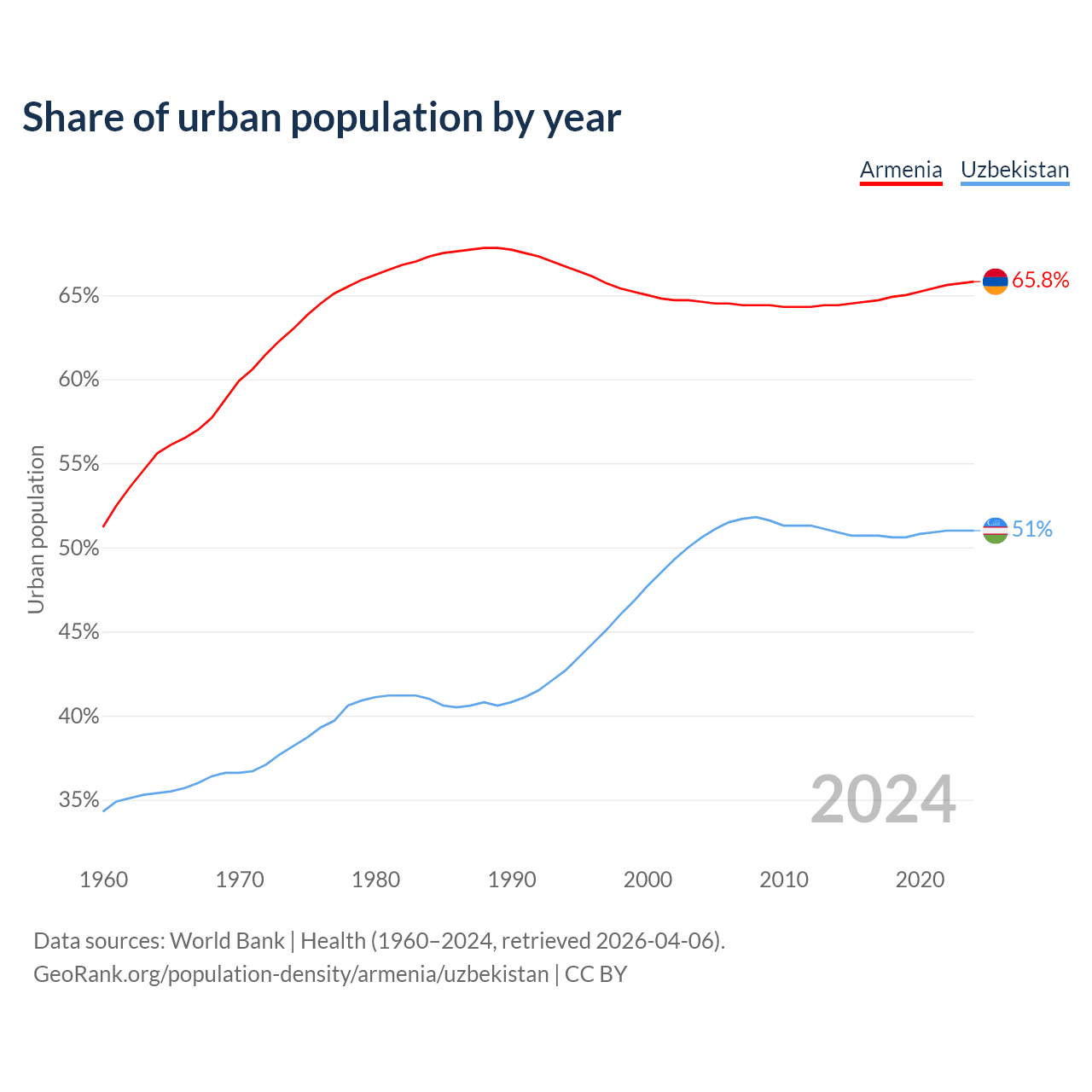 From 2004 to 2024, the share of urban population changed from 64.6% to 65.8% in Armenia and from 50.6% to 51% in Uzbekistan.
