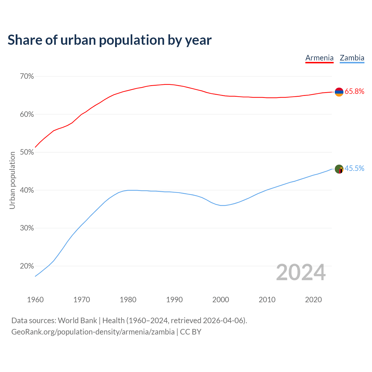 From 2006 to 2026, population density in Armenia decreased by 3.47%, compared to a 85.7% growth in Zambia.