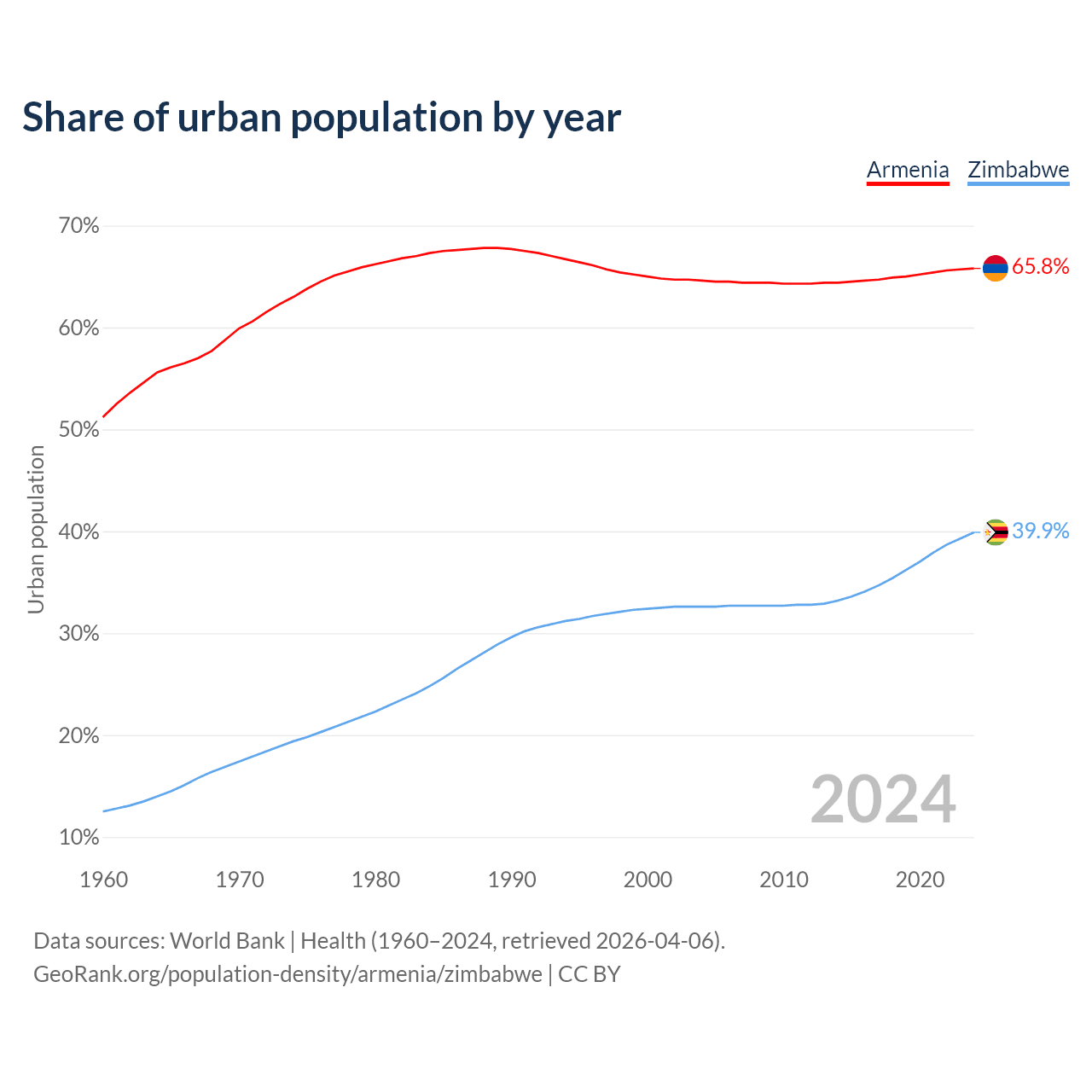 From 2004 to 2024, the share of urban population changed from 64.6% to 65.8% in Armenia and from 32.6% to 39.9% in Zimbabwe.