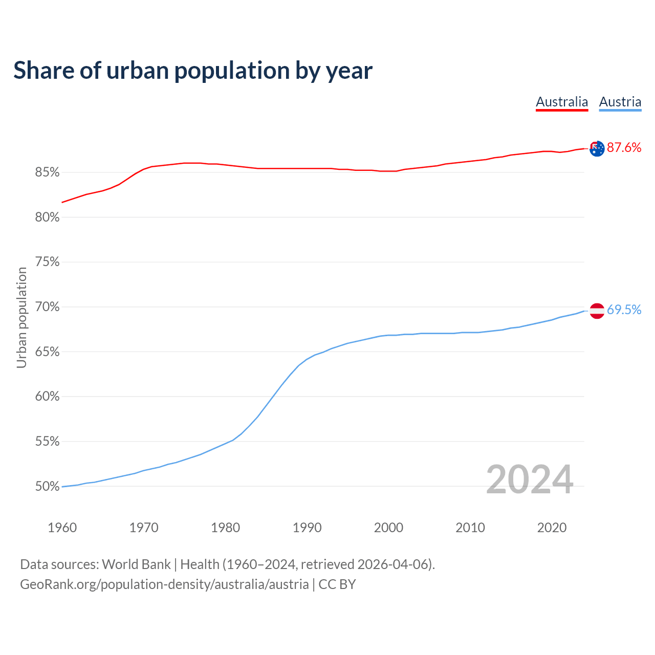 From 2004 to 2024, the share of urban population changed from 85.5% to 87.6% in Australia and from 67% to 69.5% in Austria.