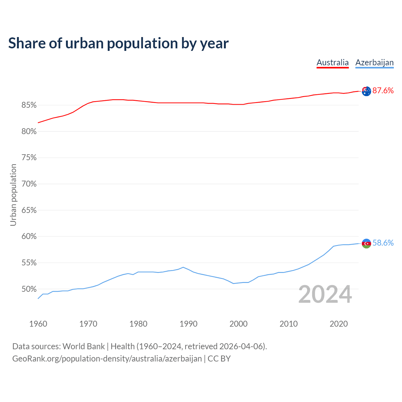 From 2004 to 2024, the share of urban population changed from 85.5% to 87.6% in Australia and from 52.3% to 58.6% in Azerbaijan.