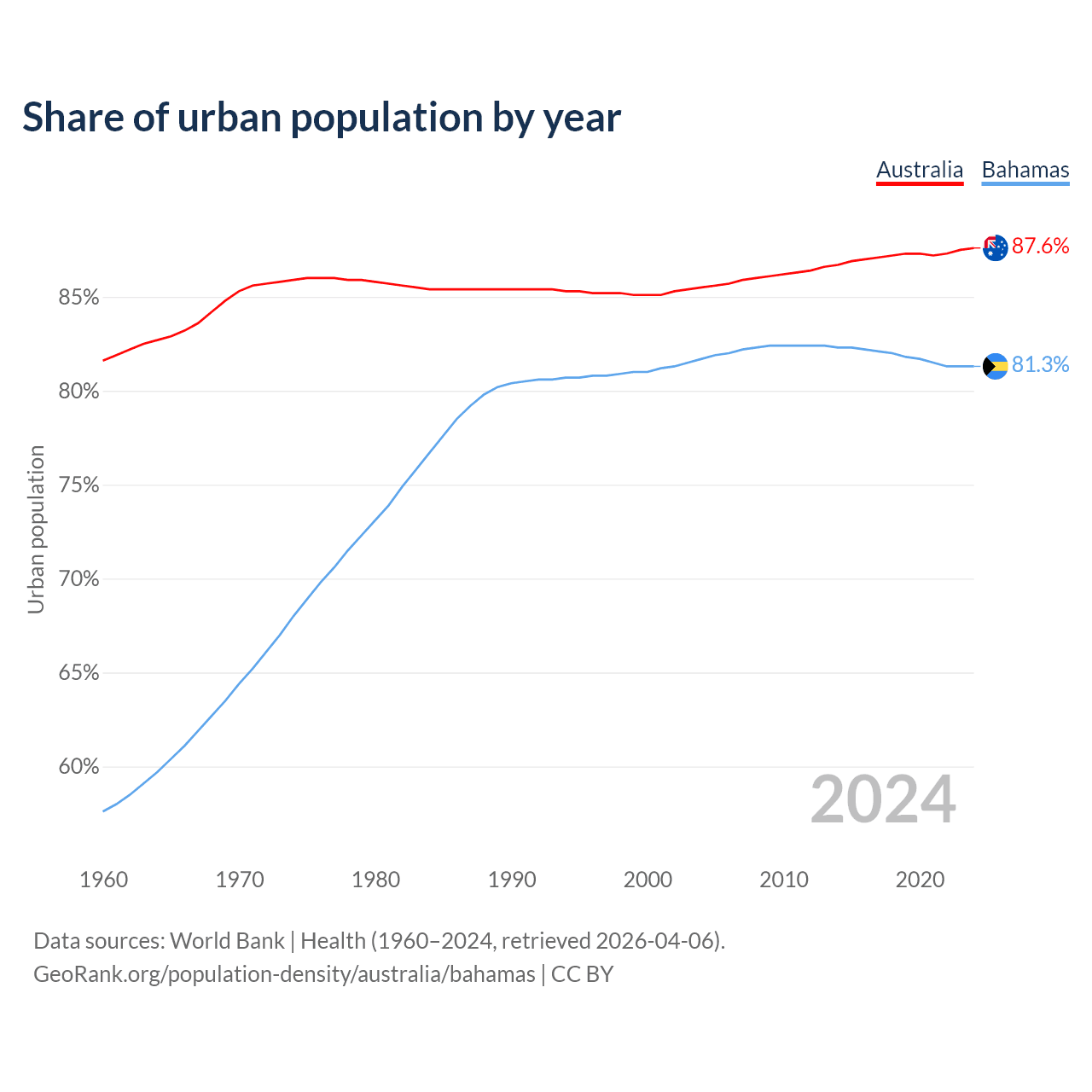 From 2004 to 2024, the share of urban population changed from 85.5% to 87.6% in Australia and from 81.7% to 81.3% in the Bahamas.