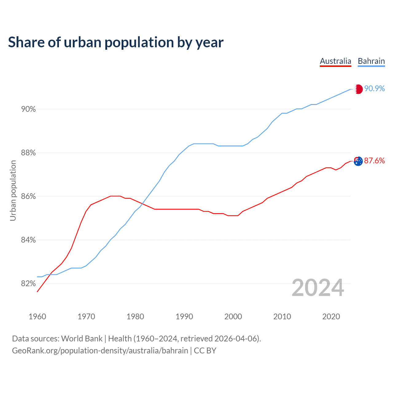From 2004 to 2024, the share of urban population changed from 85.5% to 87.6% in Australia and from 88.6% to 90.9% in Bahrain.