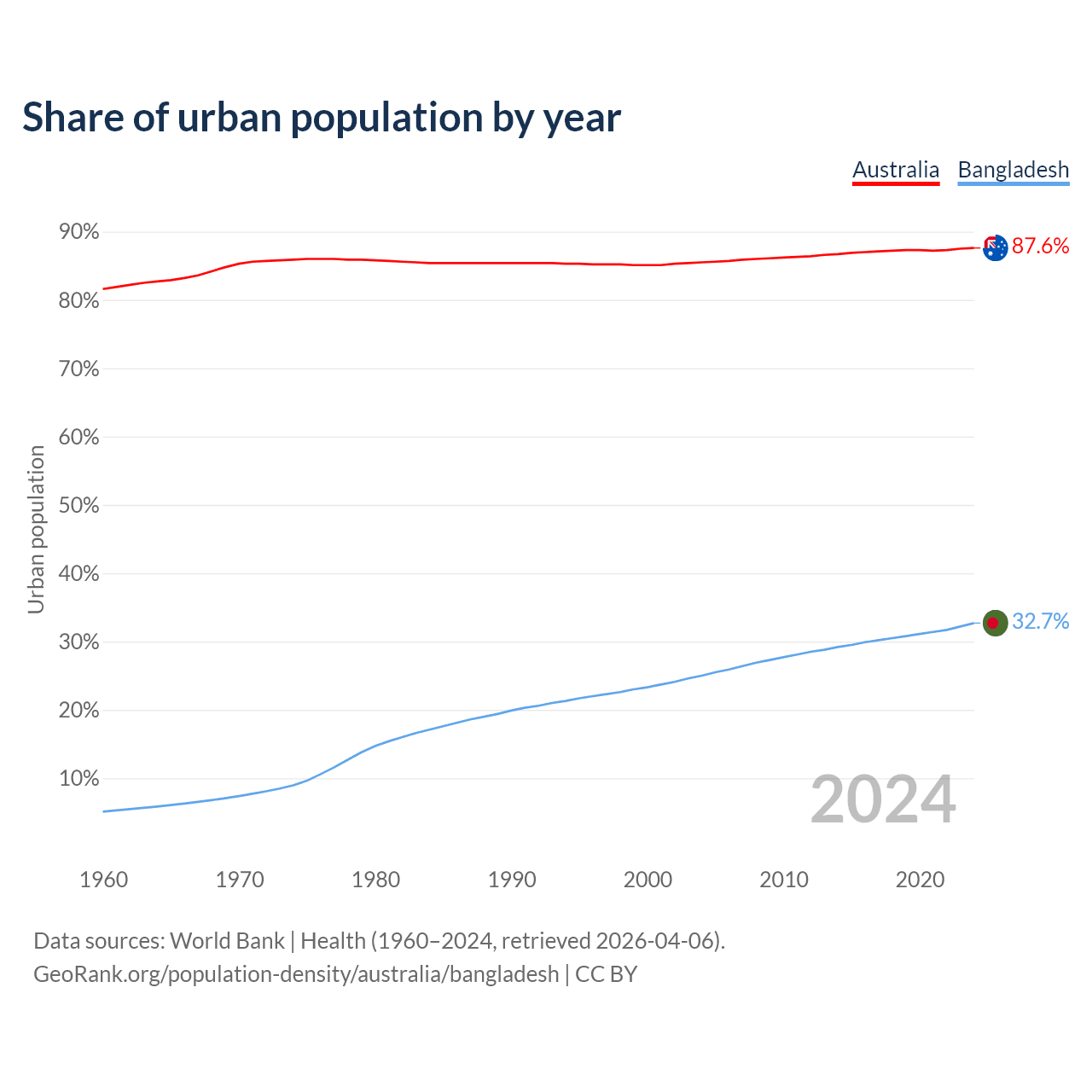 From 2004 to 2024, the share of urban population changed from 85.5% to 87.6% in Australia and from 25% to 32.7% in Bangladesh.
