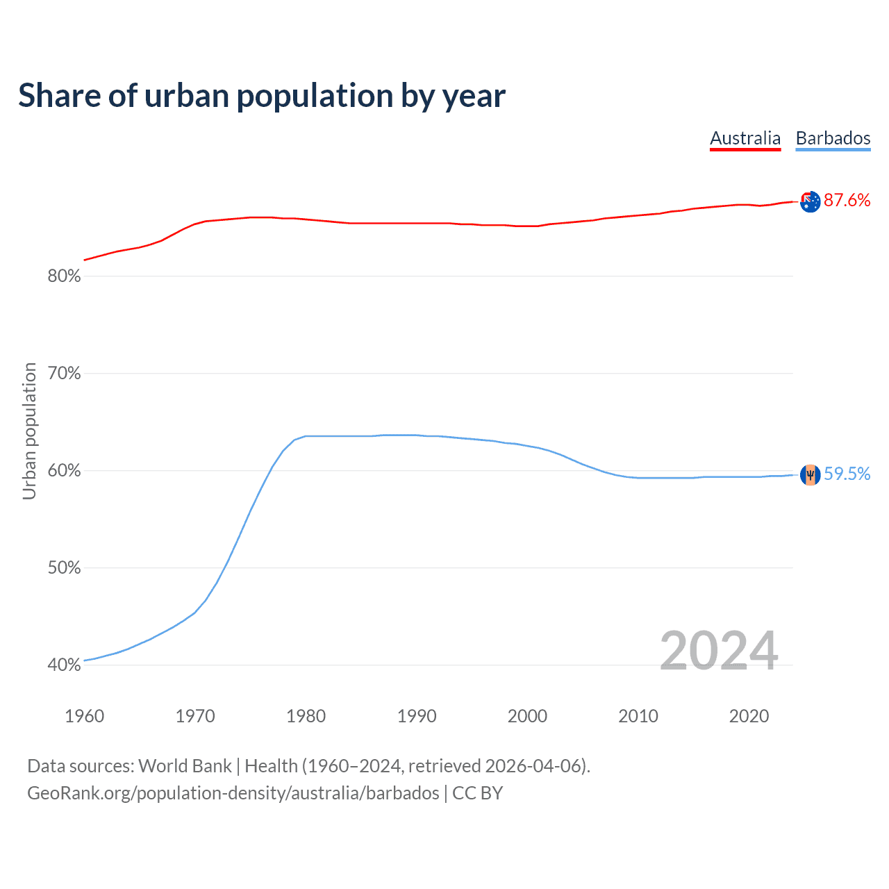 From 2004 to 2024, the share of urban population changed from 85.5% to 87.6% in Australia and from 61.1% to 59.5% in Barbados.