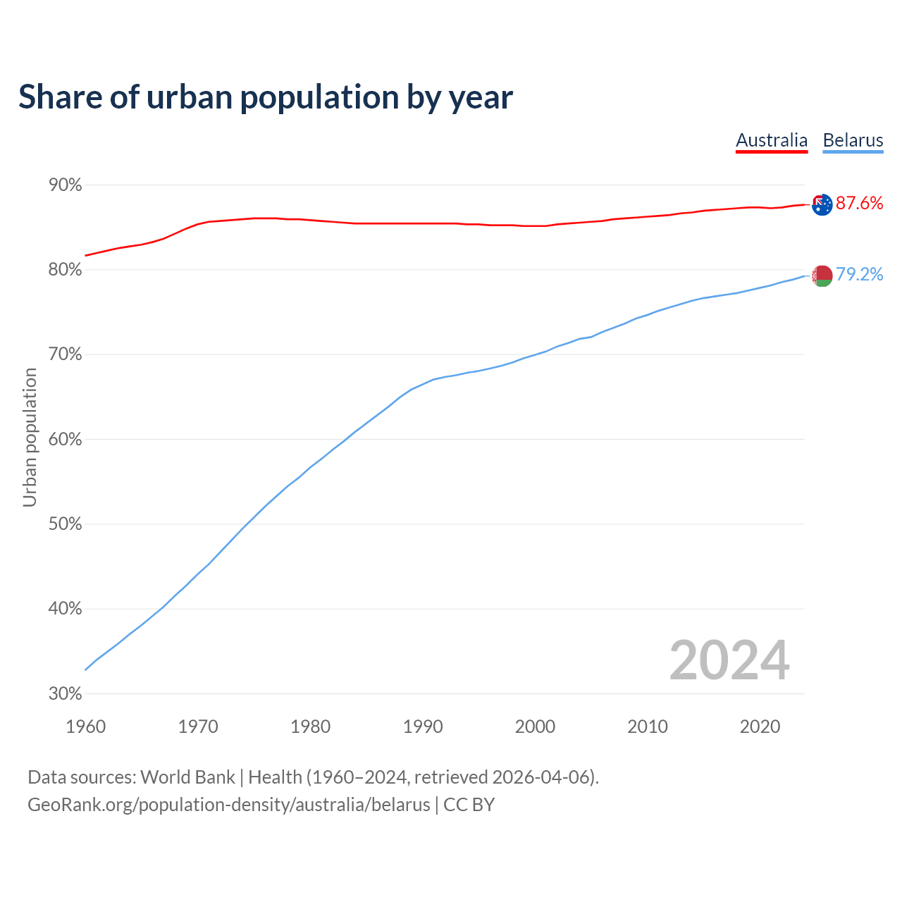 From 2004 to 2024, the share of urban population changed from 85.5% to 87.6% in Australia and from 71.8% to 79.2% in Belarus.