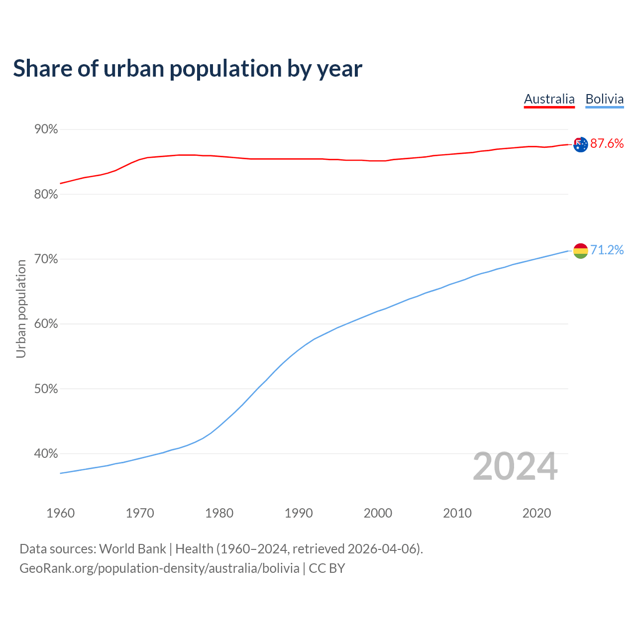 From 2004 to 2024, the share of urban population changed from 85.5% to 87.6% in Australia and from 63.8% to 71.2% in Bolivia.