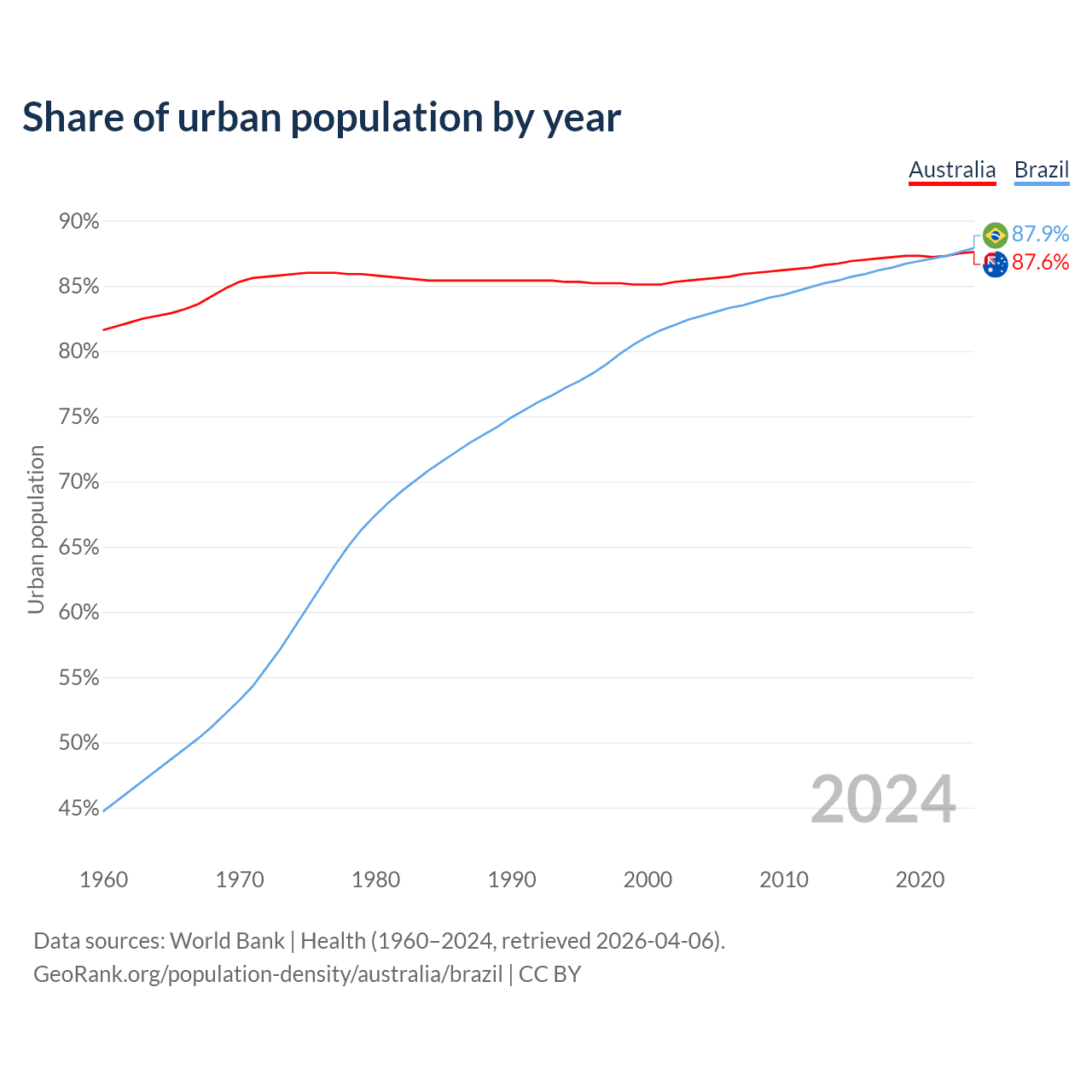 From 2004 to 2024, the share of urban population changed from 85.5% to 87.6% in Australia and from 82.7% to 87.9% in Brazil.