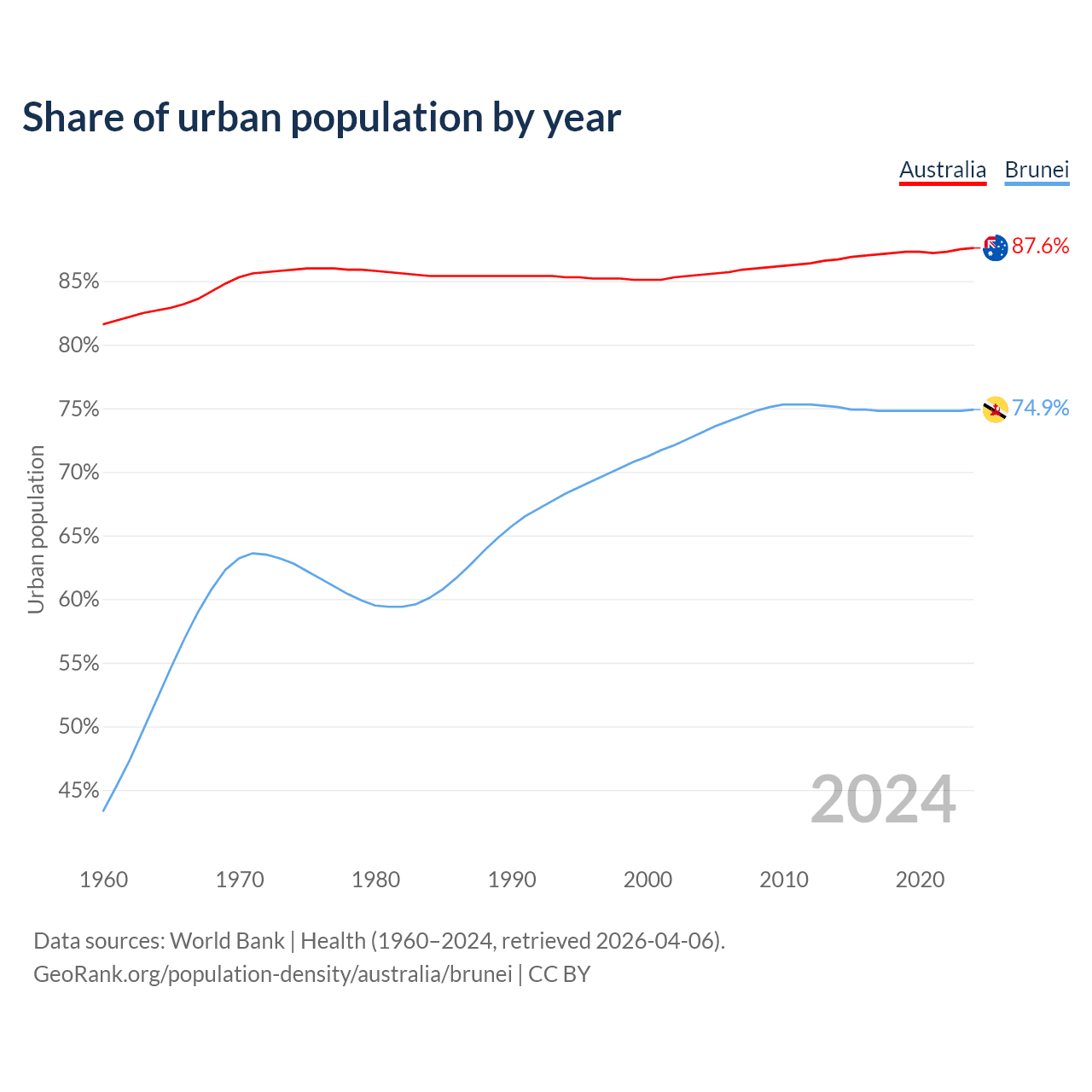 From 2004 to 2024, the share of urban population changed from 85.5% to 87.6% in Australia and from 73.1% to 74.9% in Brunei.