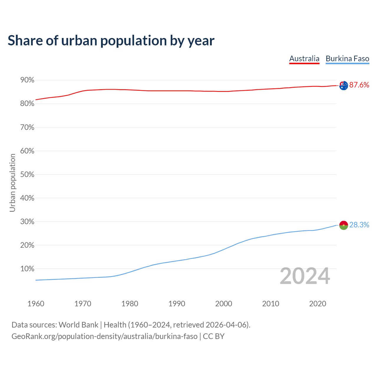 From 2004 to 2024, the share of urban population changed from 85.5% to 87.6% in Australia and from 21.3% to 28.3% in Burkina Faso.