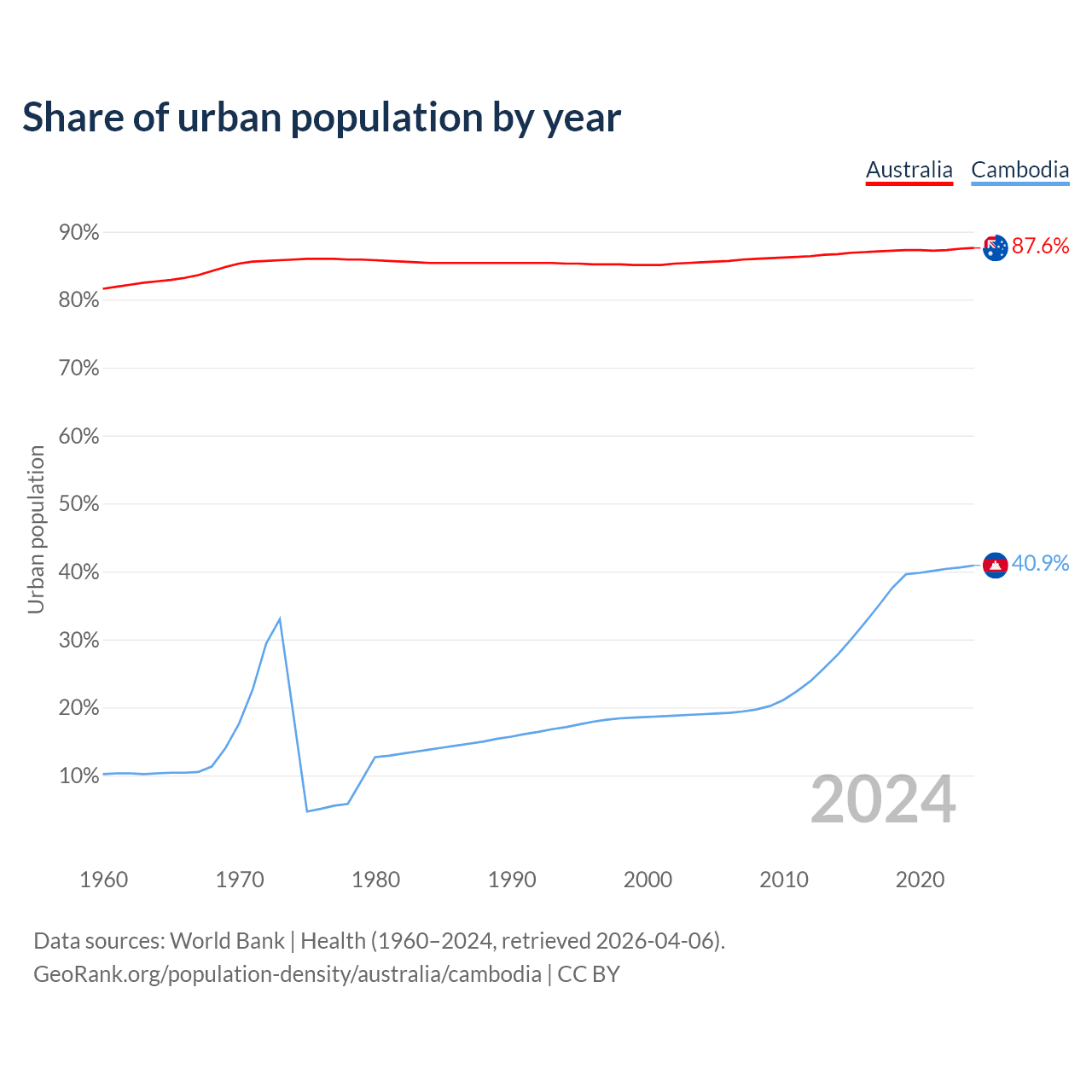 From 2004 to 2024, the share of urban population changed from 85.5% to 87.6% in Australia and from 19% to 40.9% in Cambodia.