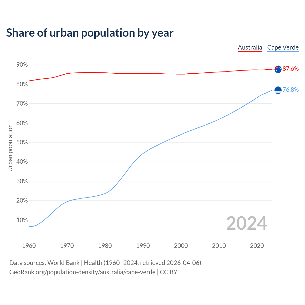From 2004 to 2024, the share of urban population changed from 85.5% to 87.6% in Australia and from 57.1% to 76.8% in Cape Verde.