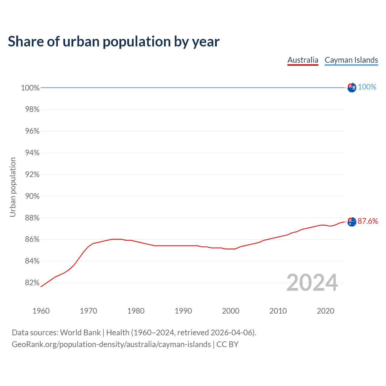 From 2004 to 2024, the share of urban population changed from 85.5% to 87.6% in Australia and from 100% to 100% in the Cayman Islands.