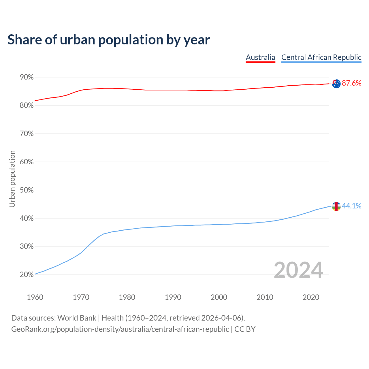 From 2004 to 2024, the share of urban population changed from 85.5% to 87.6% in Australia and from 38% to 44.1% in the Central African Republic.