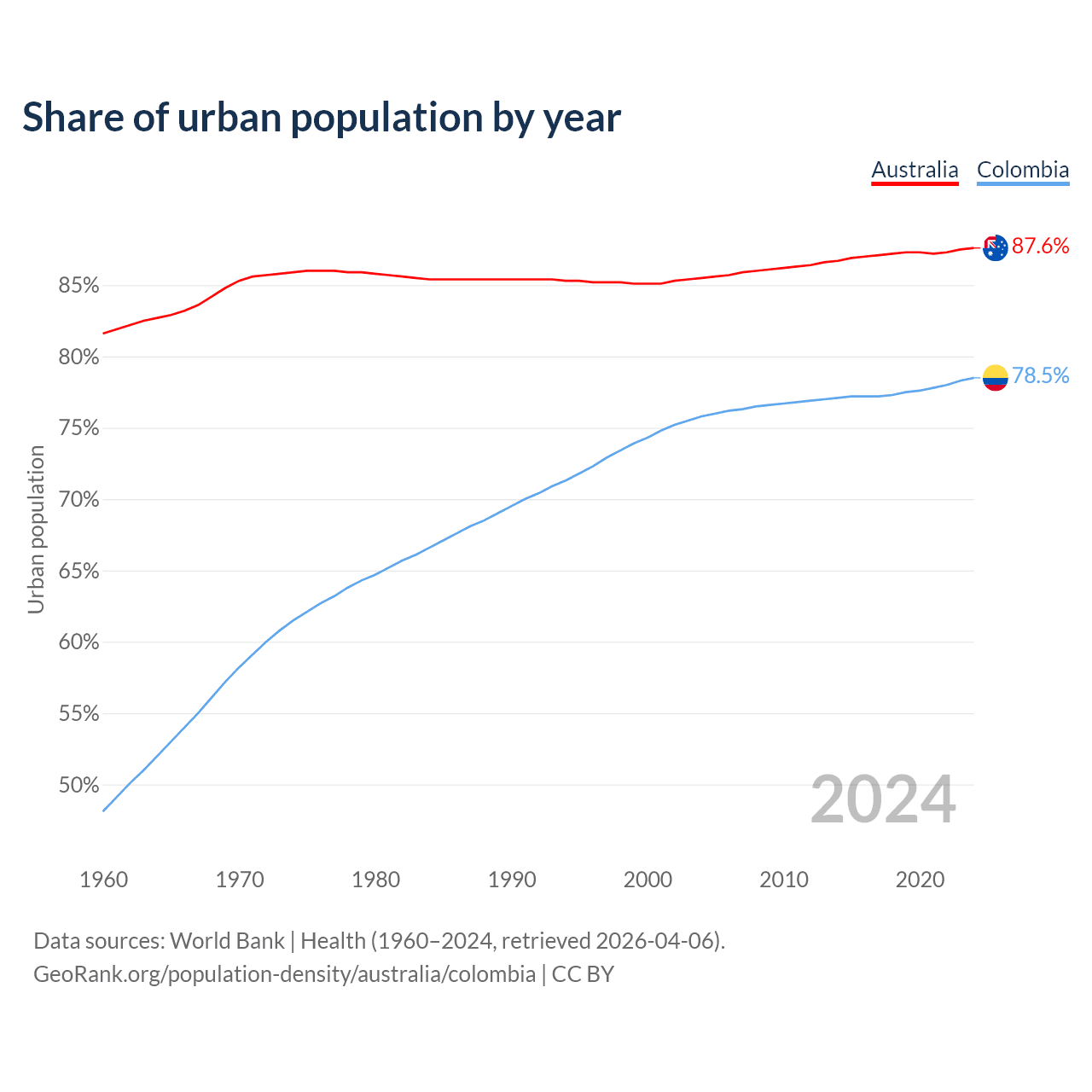 From 2004 to 2024, the share of urban population changed from 85.5% to 87.6% in Australia and from 75.8% to 78.5% in Colombia.