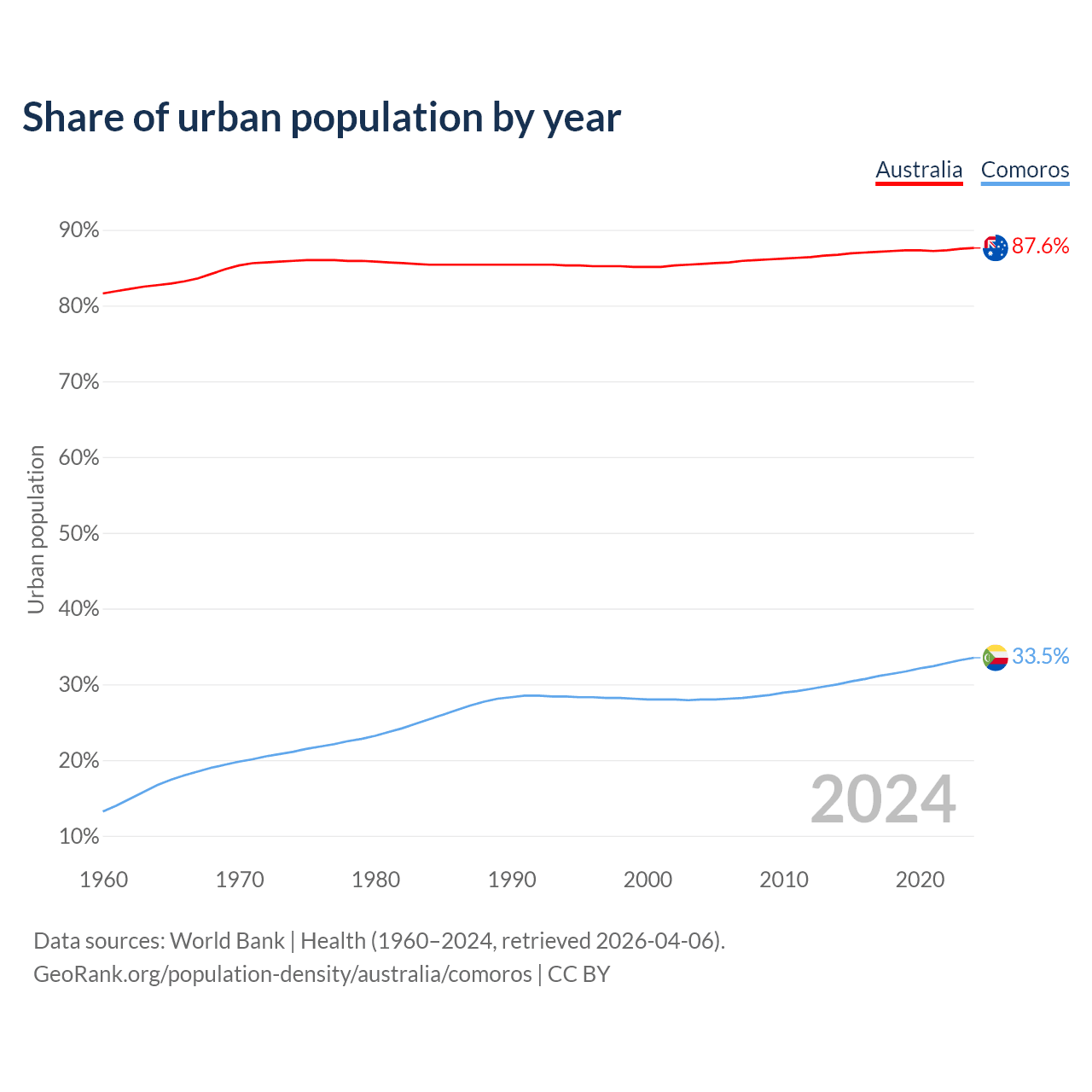 From 2004 to 2024, the share of urban population changed from 85.5% to 87.6% in Australia and from 28% to 33.5% in Comoros.