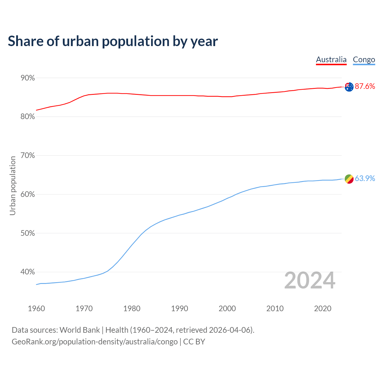 From 2004 to 2024, the share of urban population changed from 85.5% to 87.6% in Australia and from 60.9% to 63.9% in the Congo.