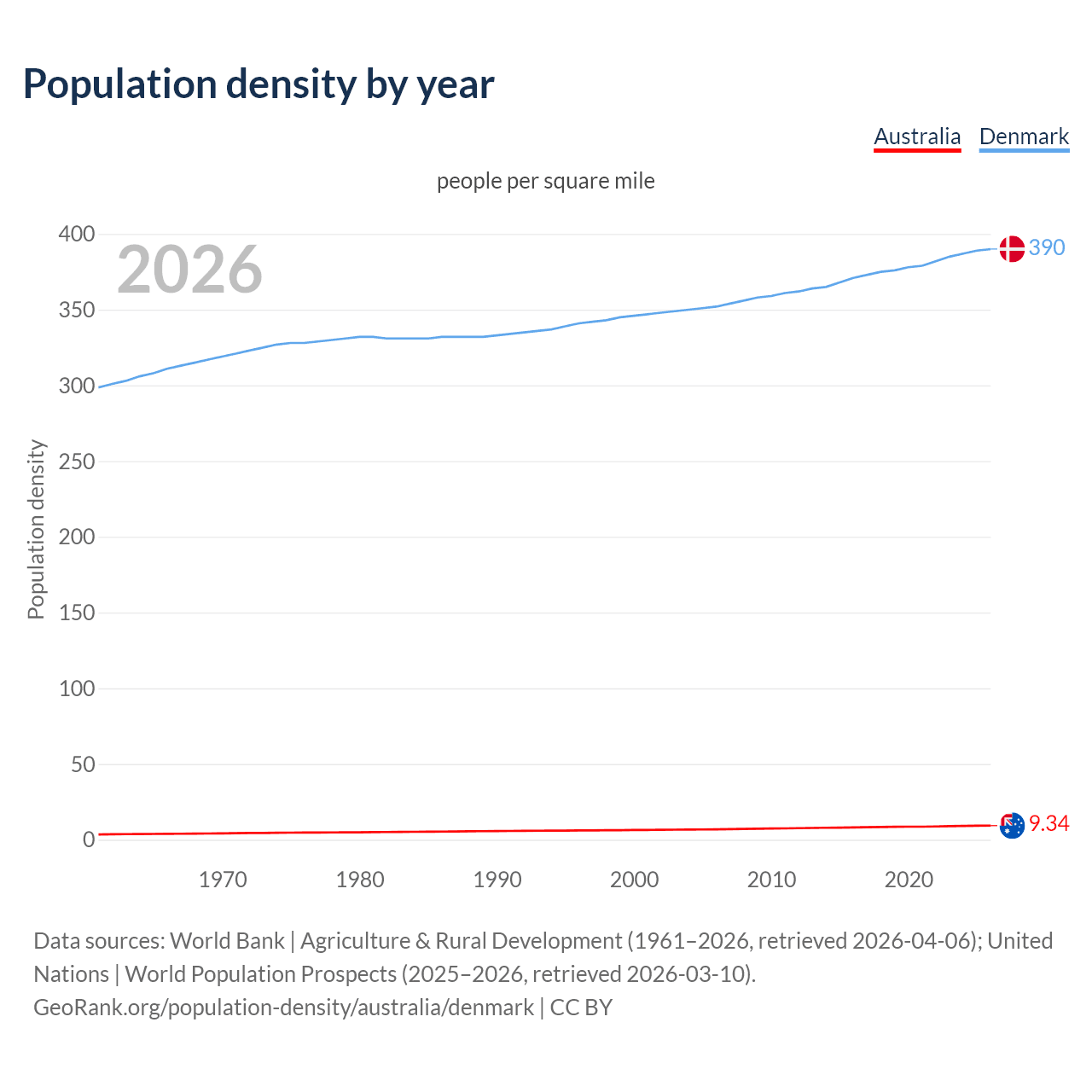 Australia has a population density of 9.34 people per square mile compared to 390 people in Denmark. Australia has 3,044,337 sq ft of land per person vs 77,304 sq ft in Denmark. Australia and Denmark rank 196th and 65th by population density, respectively.
