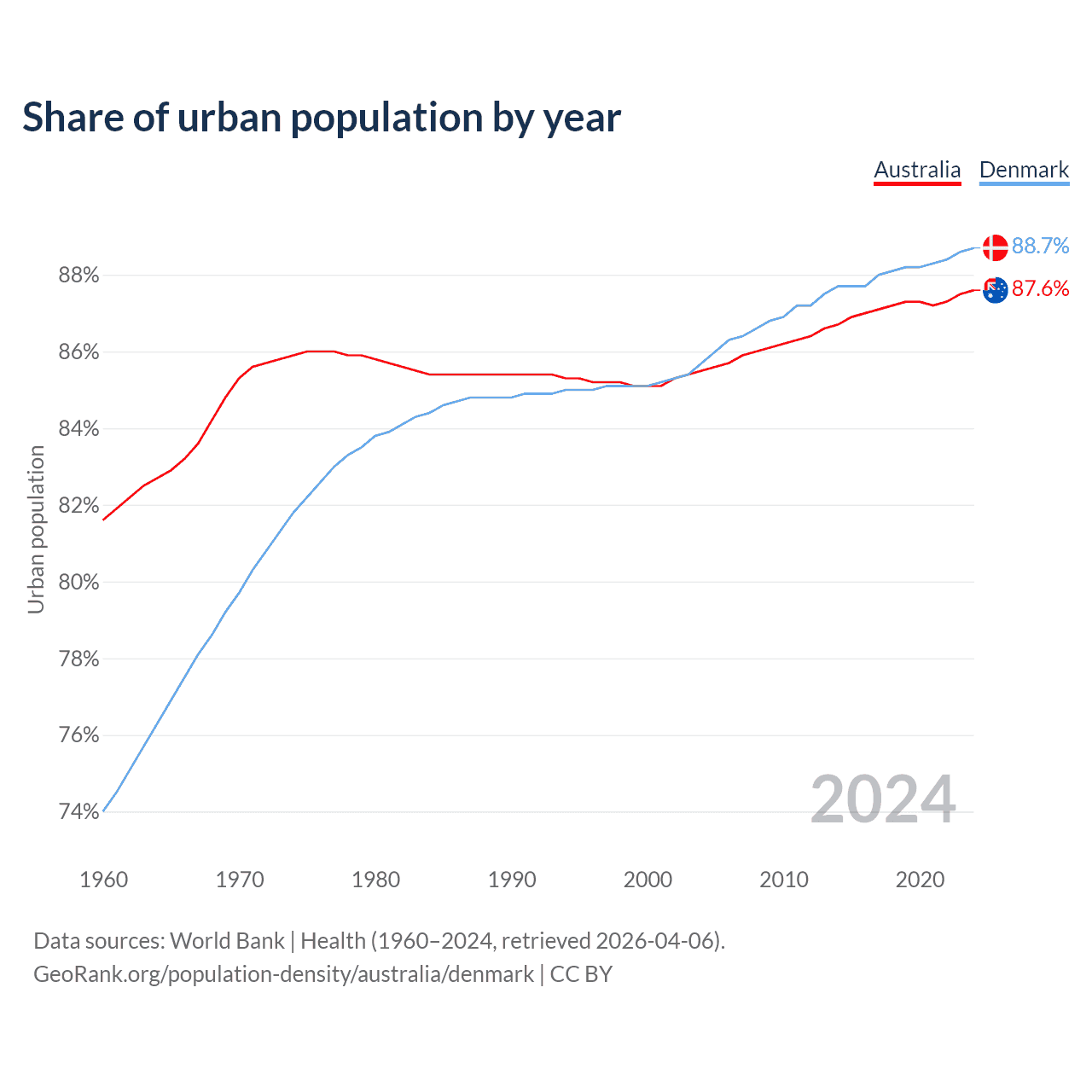 From 2004 to 2024, the share of urban population changed from 85.5% to 87.6% in Australia and from 85.7% to 88.7% in Denmark.
