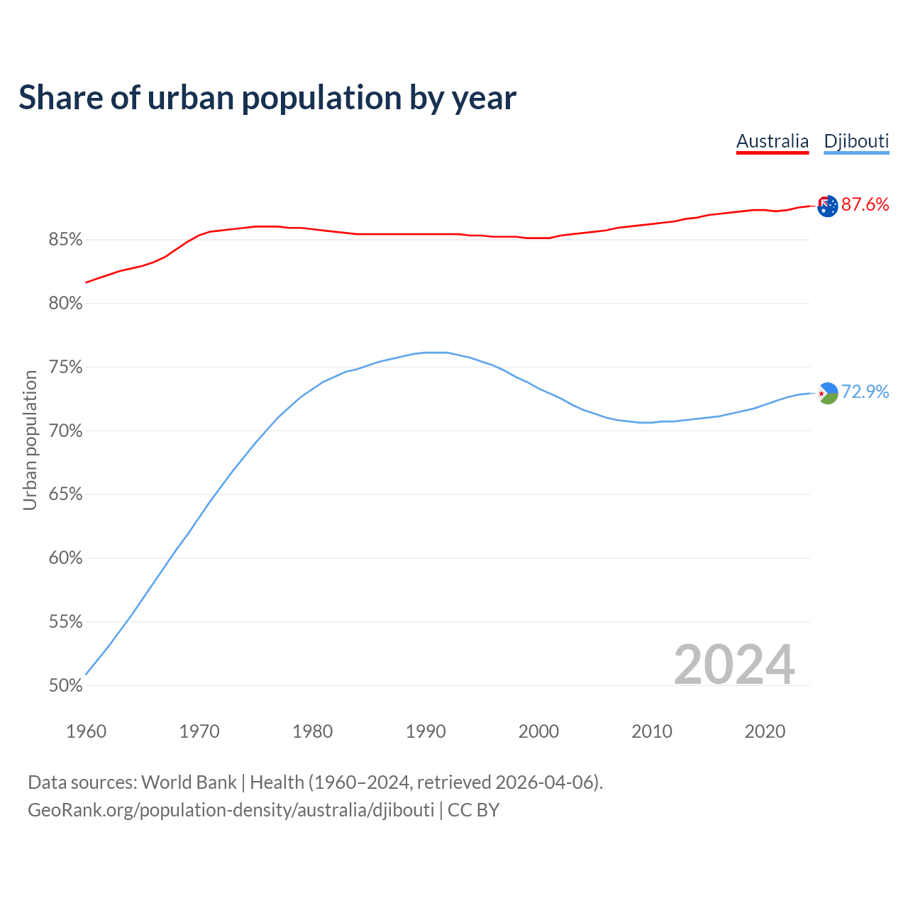From 2004 to 2024, the share of urban population changed from 85.5% to 87.6% in Australia and from 71.6% to 72.9% in Djibouti.