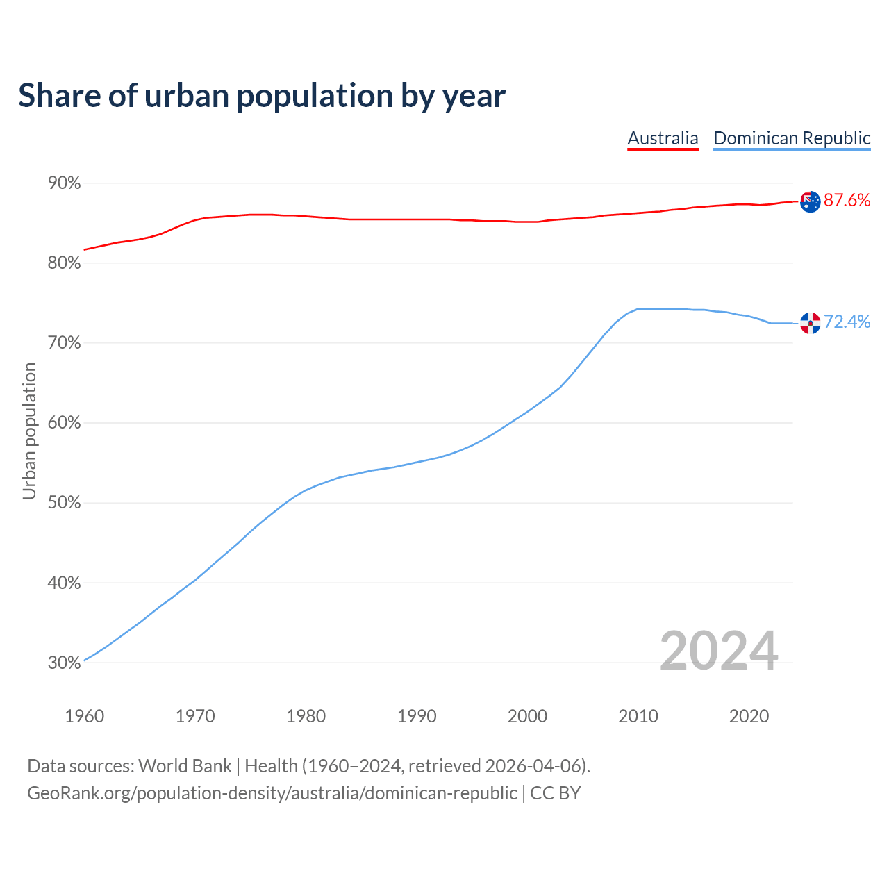 From 2004 to 2024, the share of urban population changed from 85.5% to 87.6% in Australia and from 65.9% to 72.4% in the Dominican Republic.