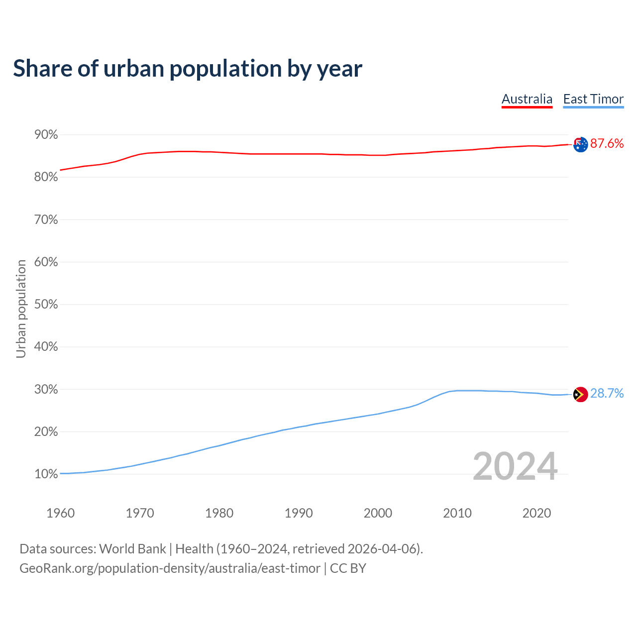 From 2004 to 2024, the share of urban population changed from 85.5% to 87.6% in Australia and from 25.7% to 28.7% in East Timor.