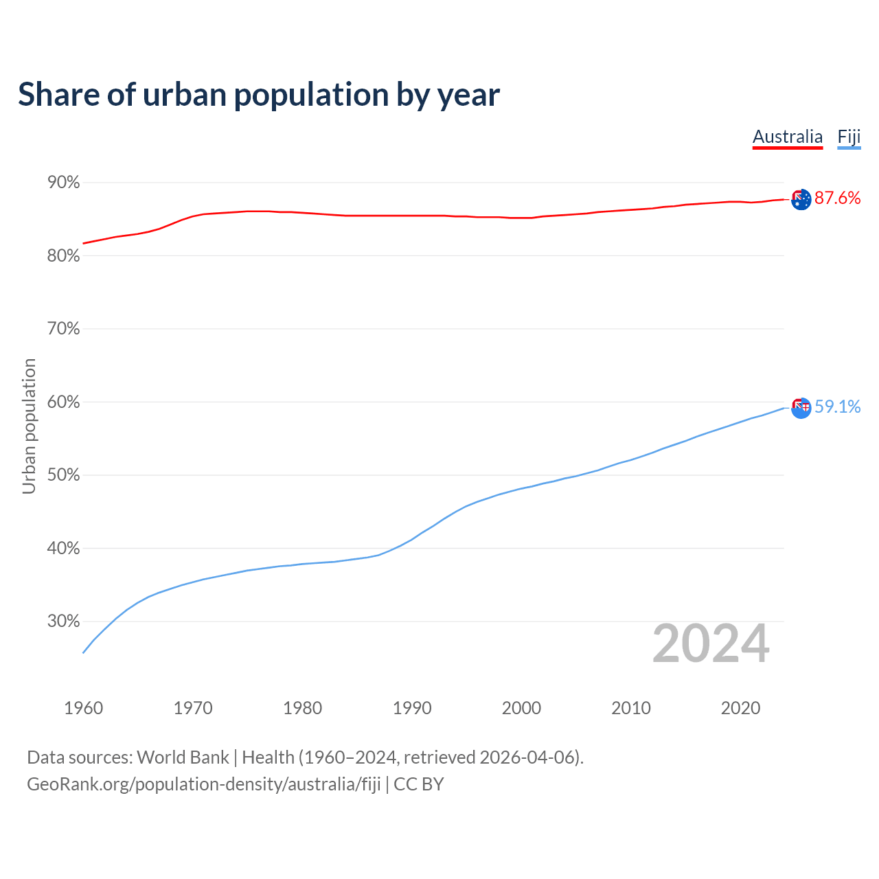 From 2004 to 2024, the share of urban population changed from 85.5% to 87.6% in Australia and from 49.5% to 59.1% in Fiji.