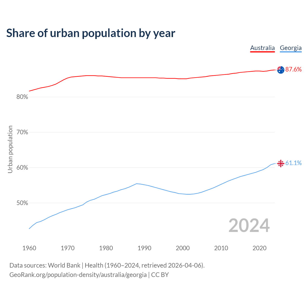 From 2004 to 2024, the share of urban population changed from 85.5% to 87.6% in Australia and from 52.7% to 61.1% in Georgia.
